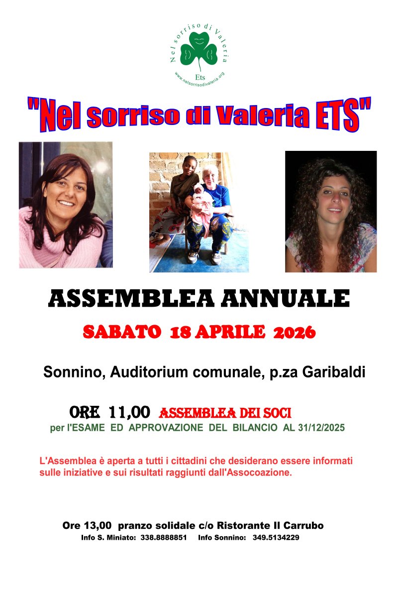 | E' convocata, Sabato 18 Aprile ore 11,00 a Sonnino presso l'Auditorium comunale in p.za Garibaldi, l'Assemblea annuale dei soci dell'Ets Nel sorriso di Valeria per l'approvazione del bilancio 2025. Presso la sede legale è depositata la documentazione, consultabile dai soci. Possono partecipare, con diritto di voto, tutti i soci in regola con il pagamento della quota sociale, che potranno essere anche portatori di due deleghe di altri soci sempre in regola col pagamento della quota e che firmino la delega in calce al foglio di convocazione. L'assemblea è altresì aperta a tutti i cittadini che desiderano essere informati sulle iniziative e sui risultati raggiunti nell'anno 2025 dall'associazione. | ||